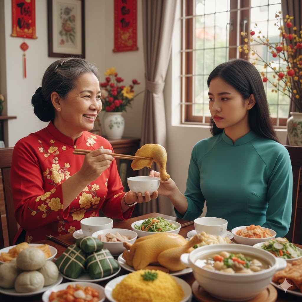 Bà gắp một miếng đùi gà vàng ươm, ngon nhất, đặt vào bát Mai. Đó là một cử chỉ rất “quê,” rất “mẹ,” ẩn chứa sự quan tâm mộc mạc và chân thành.