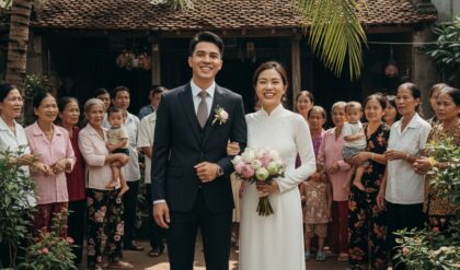 Tôi mặc chiếc váy cưới trắng tinh khôi, tà váy dài lướt nhẹ trên nền gạch, mái tóc búi cao điểm một chiếc vương miện nhỏ lấp lánh. Khi cha nắm tay dẫn tôi ra khỏi nhà gái, tôi nhìn thấy anh — người đàn ông mà tôi tin rằng mình sẽ cùng nắm tay đi hết cuộc đời. Anh đứng đó, trong bộ vest đen, khuôn mặt không giấu nổi sự xúc động xen lẫn tự hào. Đôi mắt anh lúc ấy sáng rực, như chứa cả lời hứa về một tương lai bình yên.
