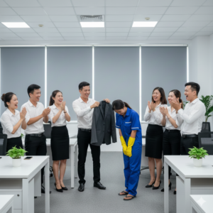 Anh chỉ mặc bộ đồng phục xanh, cầm cây lau nhà, im lặng làm việc. Nhưng lần này, anh làm bằng sự tôn trọng thật sự. Anh giúp nhân viên khác dọn kho, tự tay bê tạ giấy văn phòng, đưa nước cho bảo vệ, mở cửa thang máy cho mọi người, không còn cười cợt ai nữa.